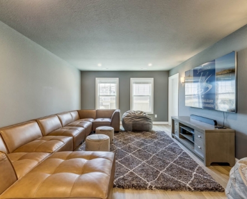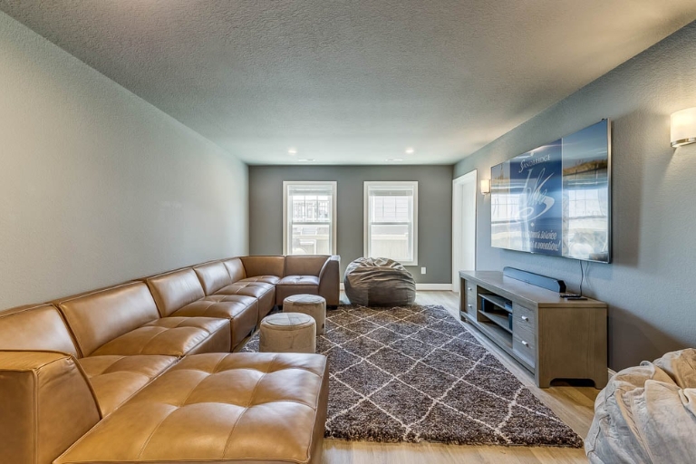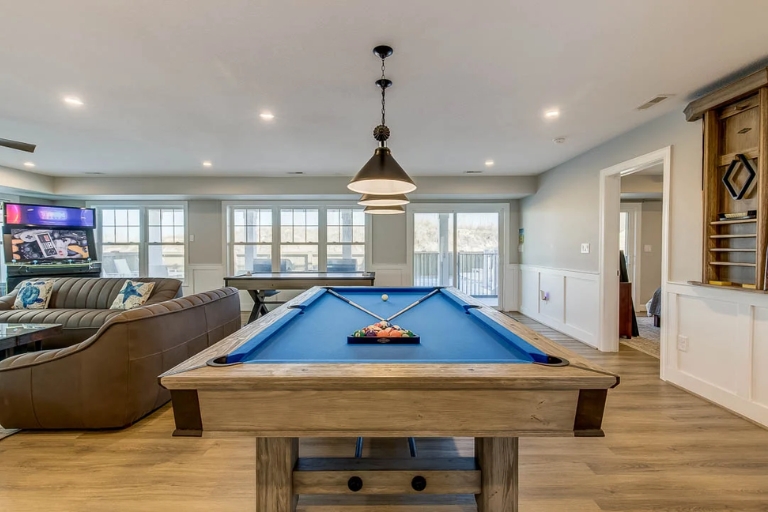The first level opens with a welcoming rec room complete with foosball, Smart TV, and a kitchenette, ideal for laid-back evenings. Nearby, guests can enjoy a private theater room for movie nights and indoor entertainment, rain or shine. Each adult bedroom suite offers a quiet escape, featuring refined finishes and en-suite baths.