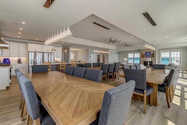 Upstairs, the main living area boasts a soaring ceiling, a sleek electric fireplace, and panoramic ocean views. The kitchen is equipped with granite countertops, two refrigerators, double dishwashers, and a spacious island perfect for gathering. The dining area seats over two dozen, making it ideal for vacationing families or friends. Outdoor amenities include a private pool, hot tub, and multiple covered decks designed for soaking in the views or enjoying a shaded retreat.