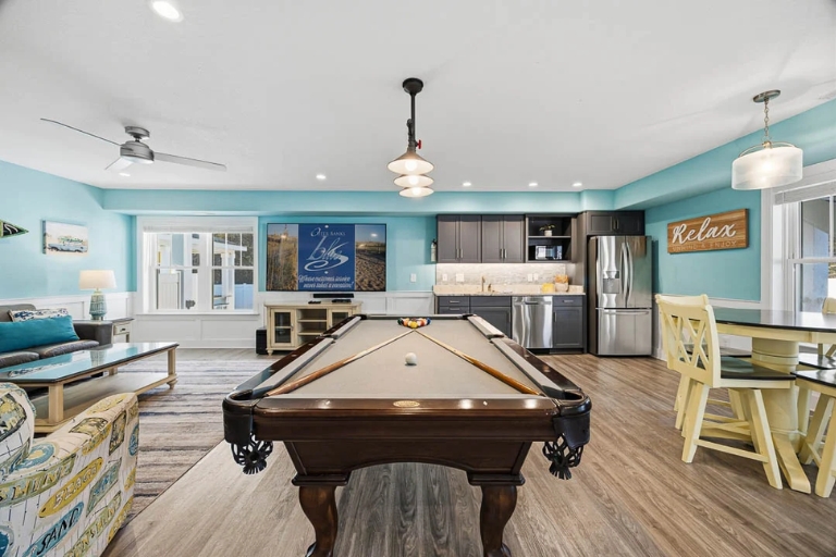 The first level features a spacious rec room with foosball, arcade games, and a full wet bar, conveniently located next to the theater room for movie nights. Multiple primary suites with ensuite baths offer elevated comfort and seclusion.