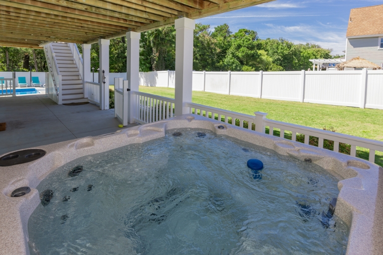 The second-level great room, framed by large windows, includes an electric fireplace, Smart TV, and seamless access to a gourmet kitchen with granite countertops, stainless appliances, and an island that seats eight. The dining area welcomes large gatherings, with space for all to dine and unwind. Step outside to enjoy a resort-style pool, integrated hot tub, and generous lounge space for soaking up the coastal sun.
